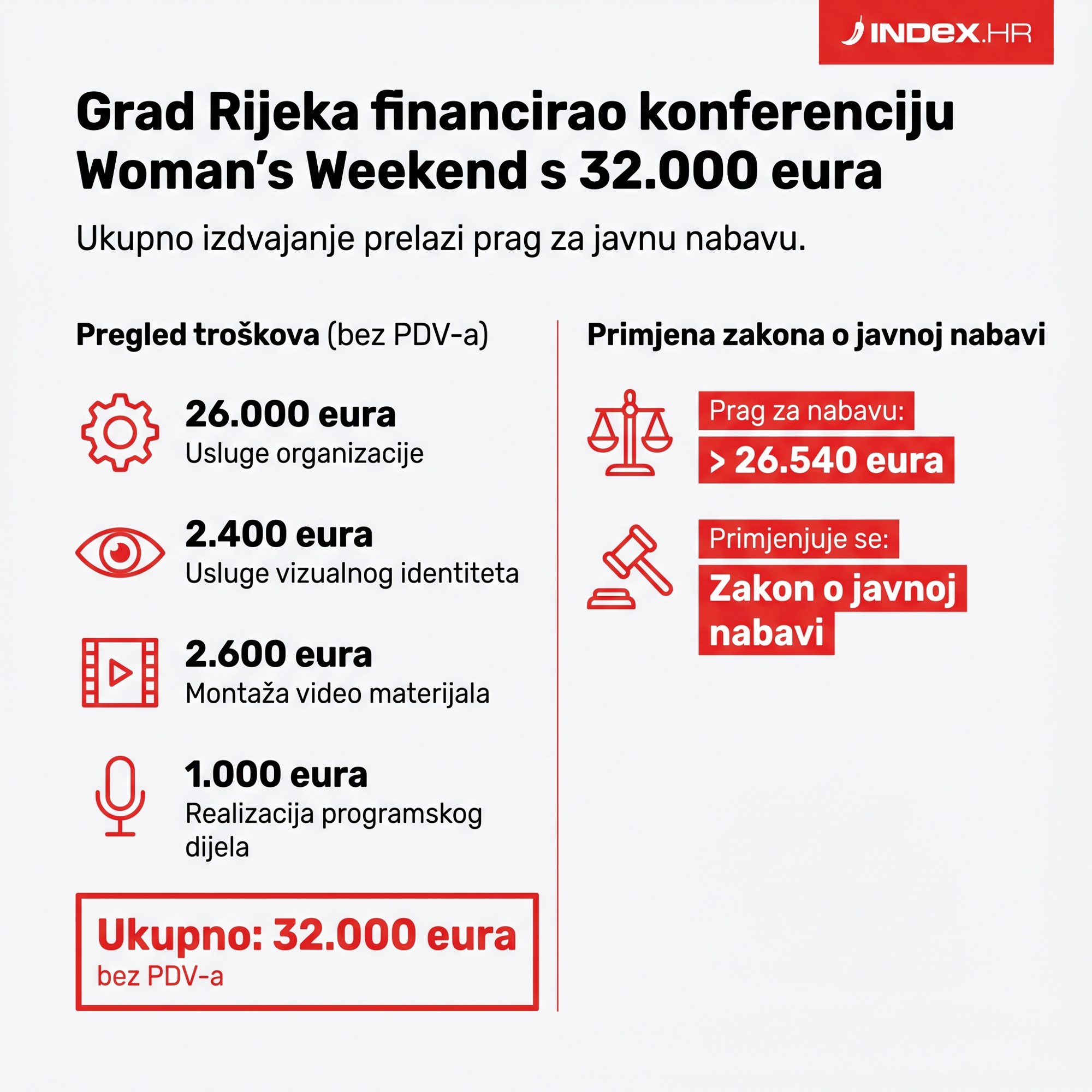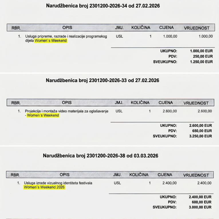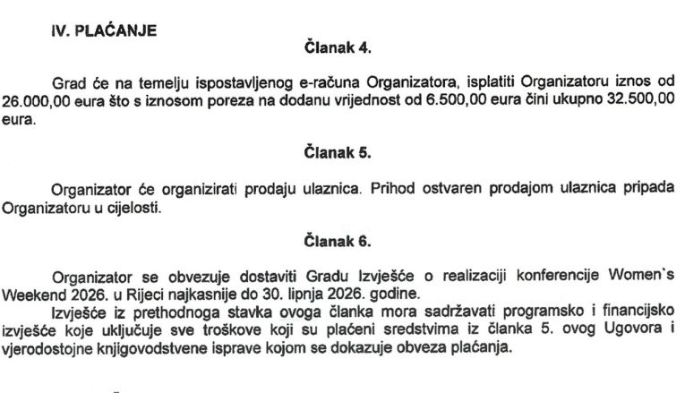 "Sukladno Pravilniku o jednostavnoj nabavi, predmet nabave bila je organizacija manifestacije Women's Weekend 2026., za što je proveden odgovarajući postupak", odgovorili su. Navode da se glavni ugovor odnosi na cjelokupnu organizaciju događaja, uključujući konceptualni i programski dio.
