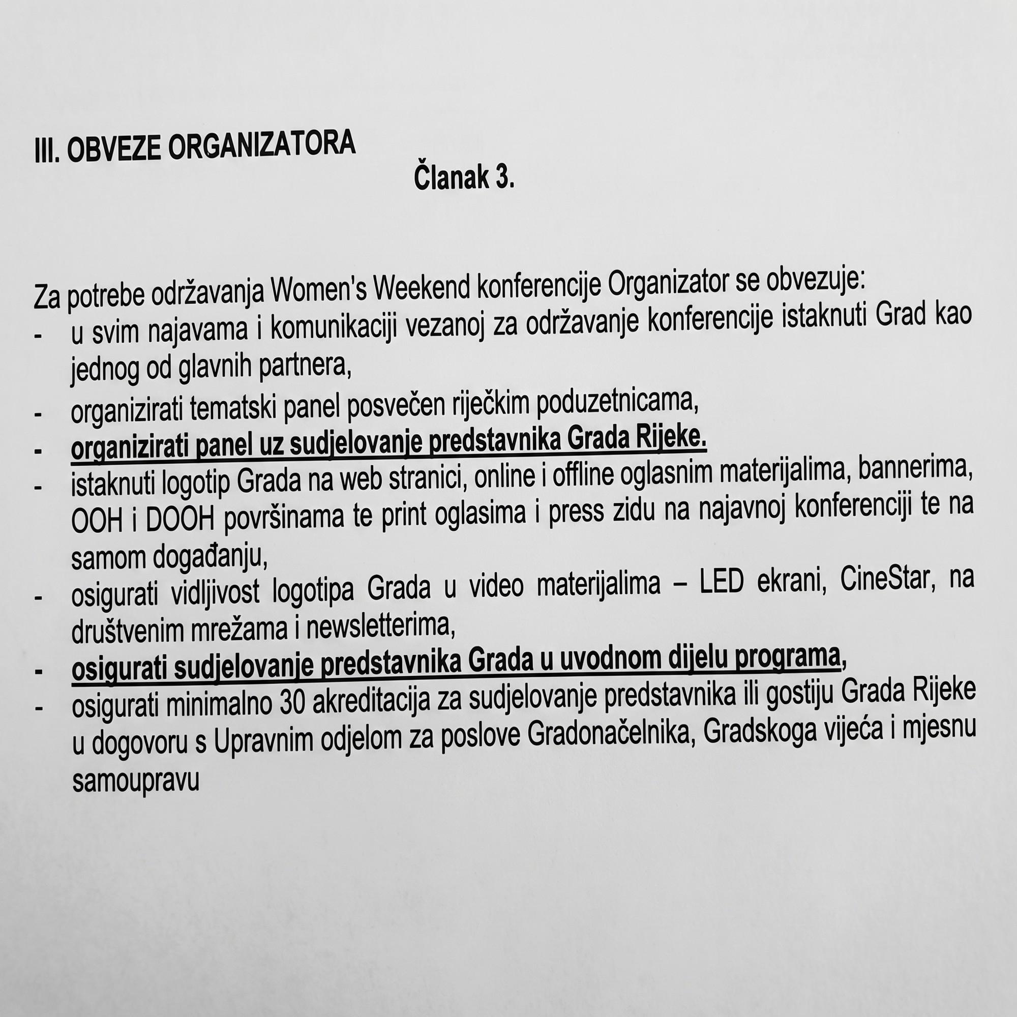 Da je sudjelovanje gradonačelnice bilo dio dogovora, vidljivo je iz ugovora između Grada Rijeke i tvrtke Prime Time Komunikacije, čija je direktorica i suvlasnica Nevena Rendeli Vejzović. Ugovor o organizaciji konferencije Women's Weekend 2026. iznosi 26 tisuća eura bez PDV-a a potpisale su ga Rinčić i Vejzović.